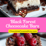 Decadent Black Forest cheesecake bars featuring a chocolate cookie crust, creamy cocoa-infused cheesecake, and a sweet-tart cherry topping. These elegant bars are easy to make, slice, and serve for any special occasion.