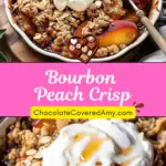 A warm and comforting Bourbon Peach Crisp made with juicy ripe peaches baked in a rich bourbon-maple sauce and topped with a golden, buttery oat and pecan crumble.