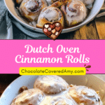 Warm, gooey Dutch oven cinnamon rolls made with frozen dough, brown sugar, cinnamon, pecans, and a rich cream cheese icing—perfect for home baking or campfire cooking with minimal effort.
