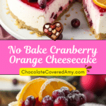No Bake Cranberry Orange Cheesecake is a festive, creamy dessert with a bright orange cheesecake filling, a sweet-tart cranberry topping, and a buttery graham cracker crust, all made without turning on the oven.
