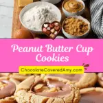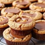 Soft and chewy peanut butter cookies baked in a mini muffin tin and topped with mini peanut butter cups for a rich, chocolatey center in every bite.