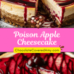 This Poison Apple Cheesecake is a decadent, fall-inspired dessert with a Halloween twist. The creamy caramel apple-flavored cheesecake is topped with a glossy red candy glaze that mimics a poison apple, while a hint of cinnamon adds warmth. Perfect for festive gatherings, autumn celebrations, or anyone craving a seasonal treat with a playful edge.