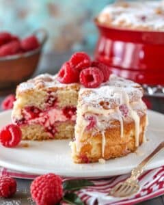 I sometimes swap raspberries for blueberries or blackberries. When I want extra texture, I add chopped nuts to the streusel. I also enjoy skipping the glaze for a less sweet, more breakfast-style cake.