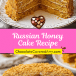 Russian Honey Cake, also known as Medovik, is a traditional layered dessert made with honey-scented cake layers and a creamy sour cream frosting. Light, tender, and flavorful, it’s a festive cake that gets even better after resting overnight.