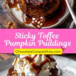 Cozy individual sticky toffee pumpkin puddings made with ultra-moist pumpkin and date cakes soaked in a rich, buttery toffee sauce—an elegant yet comforting fall dessert.