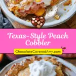 A classic Texas-style peach cobbler made with fresh ripe peaches baked under a buttery, cake-like topping that turns golden and crisp around the edges while staying soft and creamy in the center.