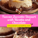 Tuscan Zuccotto is a classic dome-shaped Florentine dessert made with soft sponge cake and layered ricotta creams—one with chocolate chips and one with cocoa. Light, elegant, and stunning to serve, it’s lightly moistened with red syrup and chilled to perfection.
