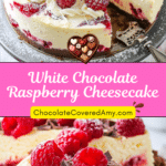 A rich and indulgent white chocolate raspberry cheesecake with an ultra-creamy filling, a tangy raspberry swirl, and a crisp chocolate cookie crust. This elegant dessert is perfect for celebrations and special occasions.