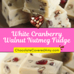 A creamy white chocolate fudge filled with tart dried cranberries, crunchy walnuts, and warm nutmeg—an easy, festive treat perfect for gifting or holiday dessert platters.