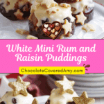 These White Mini Rum and Raisin Puddings are delightful bite-sized treats made with creamy white chocolate, rum-soaked raisins, toasted almonds, and crunchy rice bubbles. Finished with a drizzle of dark chocolate and a golden star, they’re festive, elegant, and perfect for parties or edible gifts.
